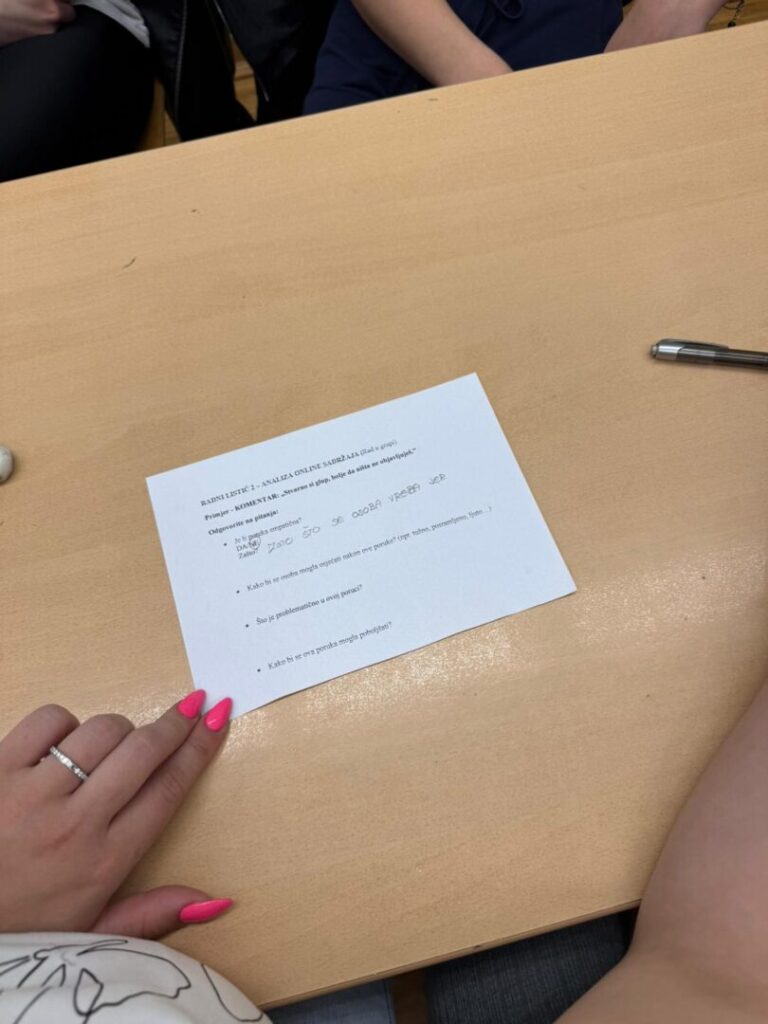 Kroz raspravu i grupni rad učenici su promišljali o razlikama između online i komunikacije uživo te upoznali pojam digitalne empatije. Analizirali su stvarne primjere poruka i komentara, a u aktivnosti „Promijeni priču“ uspješno su preoblikovali negativne sadržaje u empatične i odgovorne poruke.