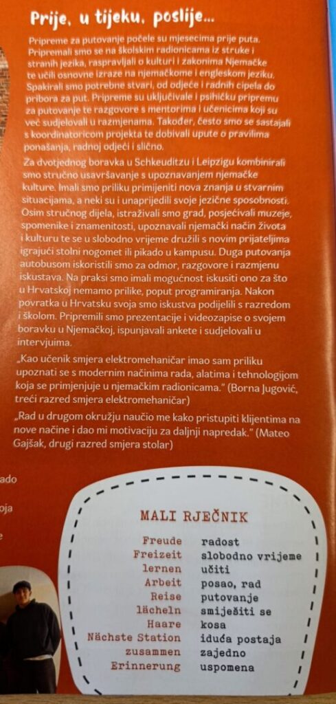 Članak donosi njihove dojmove, fotografije i najzanimljivije trenutke s mobilnosti u Njemačkoj, tijekom koje su učenici stekli nova znanja i vještine, upoznali vršnjake iz različitih europskih zemalja te na najbolji mogući način predstavili našu školu.
