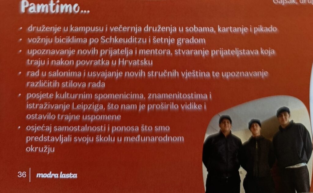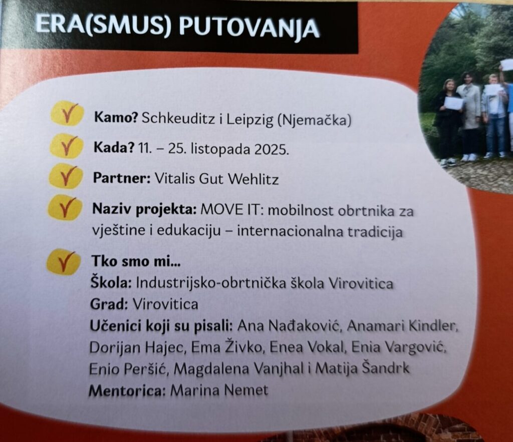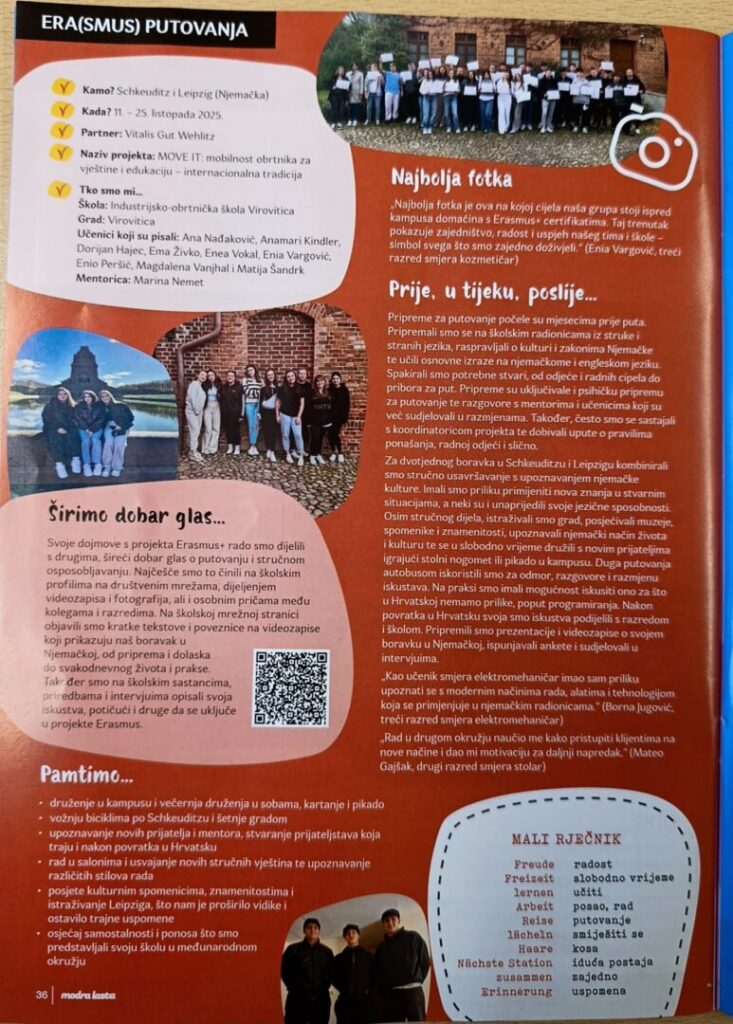 Ponosno dijelimo vijest da je iskustvo naših učenika u sklopu Erasmus+ projekta pod radnim nazivom „MOVE IT: Mobilnost Obrtnika za Vještine i Edukaciju – Internacionalna Tradicija (br. projekta: 2025-1-HR01-KA121-VET-000320688)“ predstavljeno u časopisu Modra lasta!