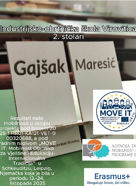 U sklopu projekta MOVE IT učenici 2. razreda zanimanja stolar, Dominik Maresić i Mateo Gajšak, izradili su stalak za mobitel. Kroz ovaj praktični zadatak učenici su pokazali vještine obrade drva, preciznost u radu te funkcionalno i kreativno oblikovanje proizvoda. Izrada stalka jedan je od rezultata projekta kojim se potiče razvoj strukovnih kompetencija, timski rad i praktično učenje.