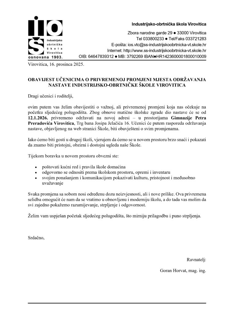 objavljujemo dopis ravnatelja s važnim informacijama. Molimo da ga pažljivo pročitate. Hvala.