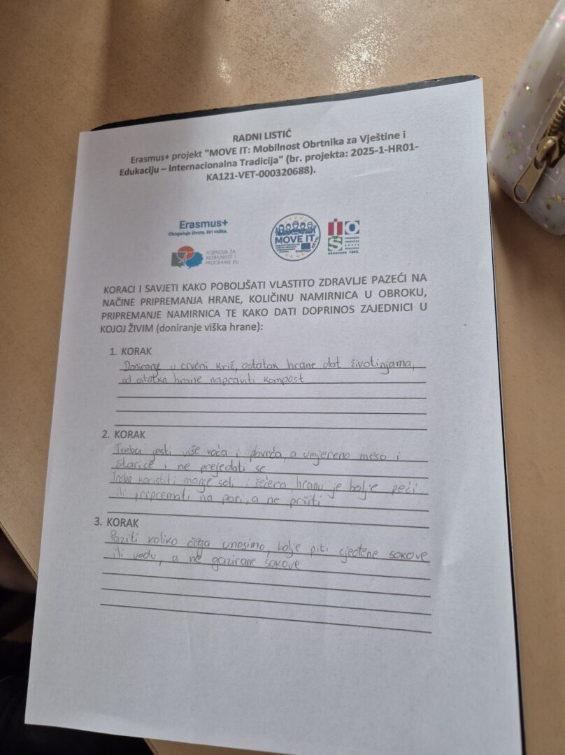 U ponedjeljak, 9. veljače 2026., na satu Nutricionizma obrađena je tema „Prehrambene navike, pripremanje hrane i socio-ekološka svijest o raspolaganju hranom budućih kozmetičara” u sklopu Erasmus+ projekta MOVE IT: Mobilnost Obrtnika za Vještine i Edukaciju – Internacionalna Tradicija (br. projekta: 2025-1-HR01-KA121-VET-000320688).