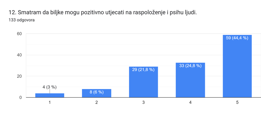Velika većina ispitanika istaknula je da prisutnost biljaka u prostoru povećava osjećaj ugode, opuštenosti i zadovoljstva, dok su mnogi naveli da im boravak u zelenom kutku pomaže u boljoj koncentraciji tijekom čitanja i učenja.